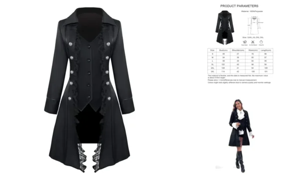 Este abrigo Feynman se presenta como una pieza clave para los amantes de lo oscuro y alternativo. Diseñado para capturar la esencia gótica, steampunk, victoriana y medieval, este atuendo promete un estilo distintivo para eventos temáticos o para quienes disfrutan de una estética audaz en su día a día. Su corte y detalles en encaje buscan evocar una época pasada con un toque moderno.