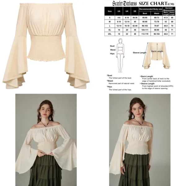 SCARLET DARKNESS presenta una blusa que evoca la opulencia de épocas pasadas, diseñada para la mujer que busca un toque distintivo en su vestuario. Perfecta para recreaciones históricas, eventos temáticos góticos, steampunk o como una declaración audaz en tu día a día alternativo. Su diseño de hombros descubiertos y mangas fluidas la convierten en una pieza llamativa.