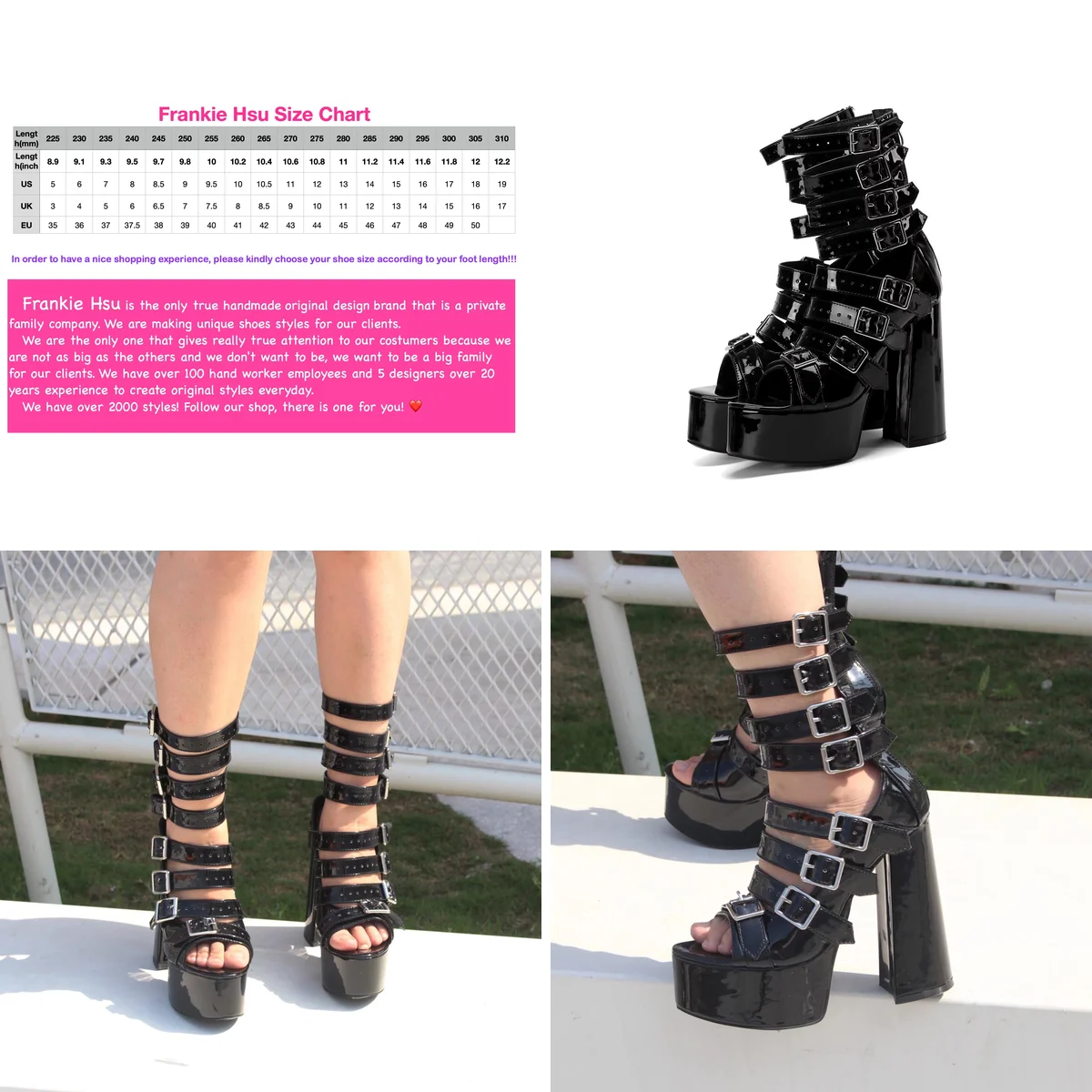 Para la devota del estilo gótico y Lolita que busca elevar sus atuendos con un toque de audacia. Estas botas de tacón alto de charol negro con plataforma y hebilla son la pieza central perfecta para eventos especiales, sesiones fotográficas o simplemente para quienes viven la estética oscura con intensidad.