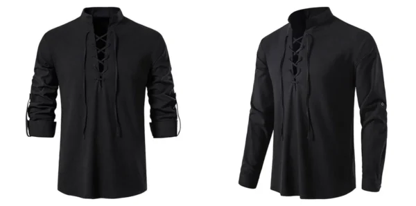 Esta camisa de lino de manga larga, con cuello alto y cordones, es para el entusiasta del estilo gótico, steampunk o medieval que busca una prenda con carácter para sus eventos o para añadir un toque distintivo a su vestuario de ocio. Diseñada para ofrecer transpirabilidad y un ajuste cómodo, se presenta como una opción de moda alternativa.