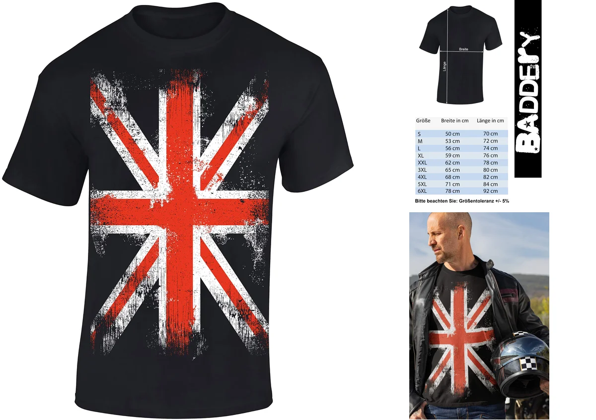 Esta camiseta de la marca Baddery, con su audaz diseño de la Union Jack, es para aquellos que llevan la rebeldía británica en la sangre. Perfecta para conciertos, eventos de rock, o simplemente para mostrar tu orgullo por Inglaterra con un toque alternativo.