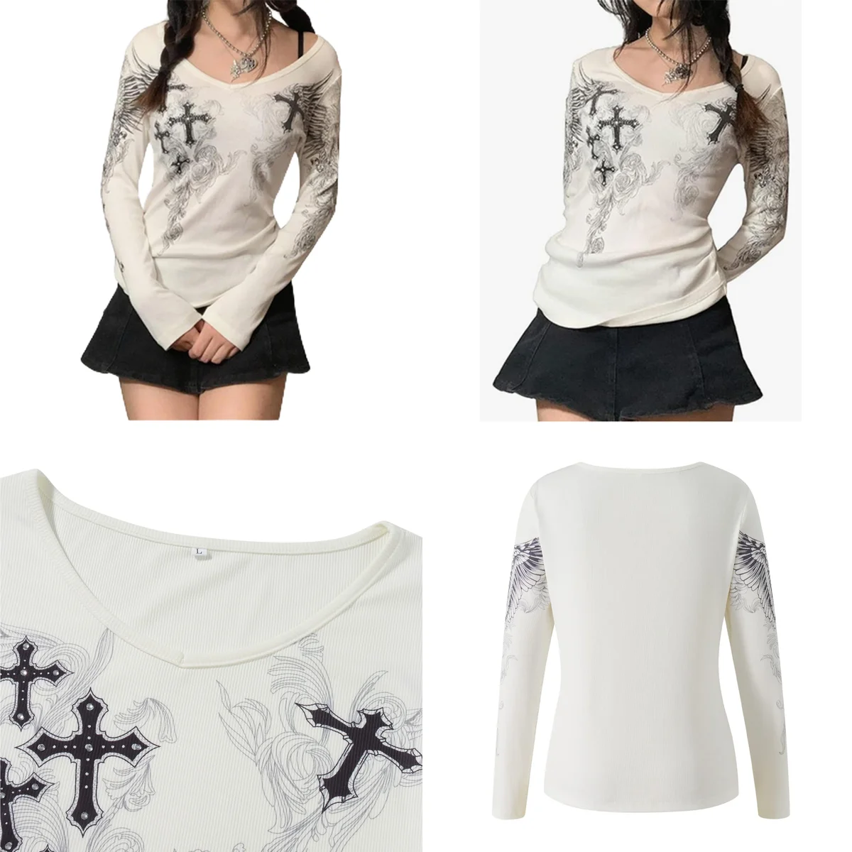 Para las que viven la estética oscura y no temen mostrar su lado más rebelde, esta camiseta de manga larga Y2k con estampado gótico es una opción que grita primavera y otoño. Perfecta para quienes buscan ese toque retro y alternativo en su día a día, desde la calle hasta eventos casuales.