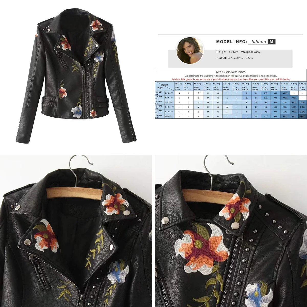 - Diseño: Corte de motorista clásico con un toque distintivo de bordado floral, aportando un contraste visual que rompe con lo convencional.