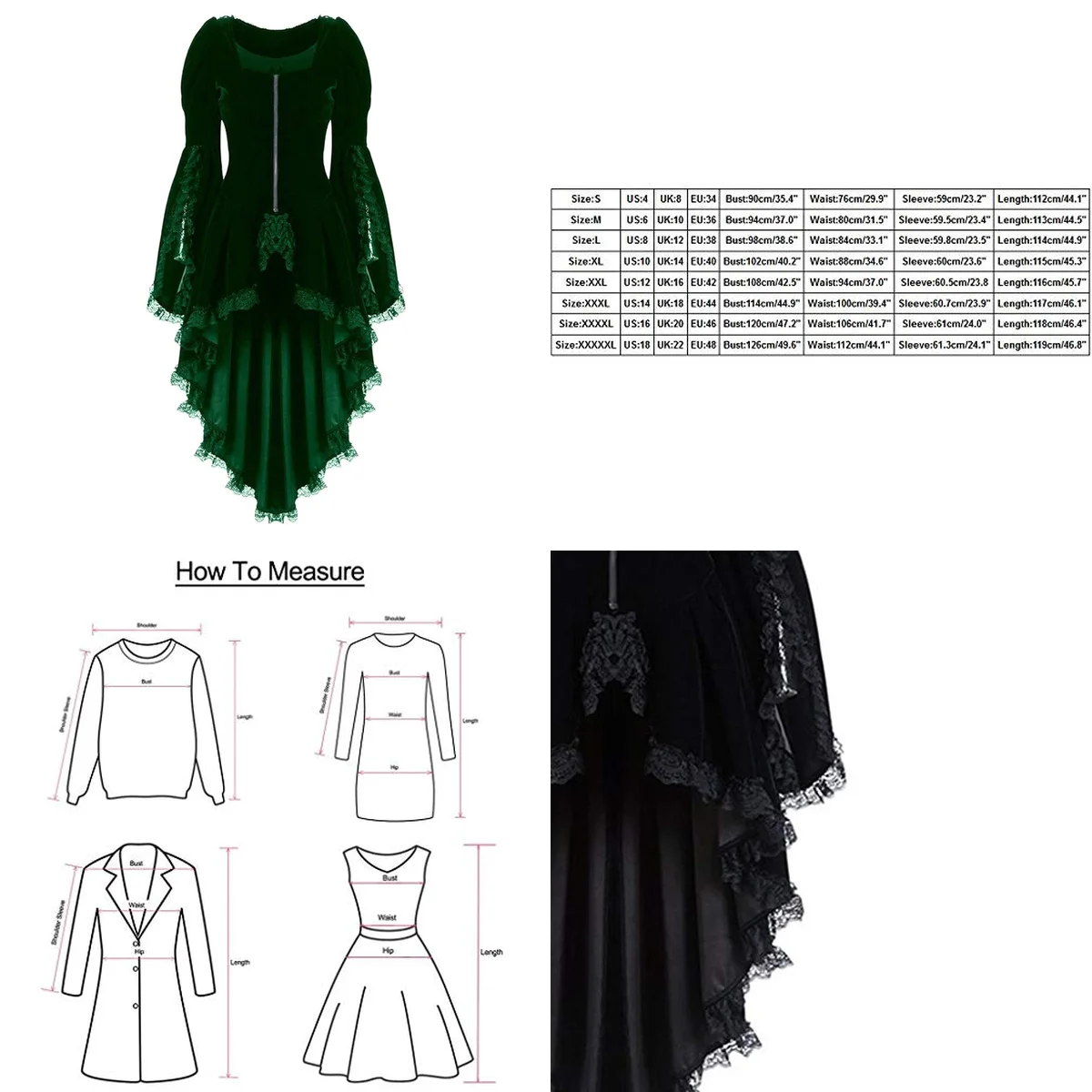 - Detalles de Encaje: Apliques de encaje intrincado en puños y solapas, añadiendo un toque de elegancia barroca y decadencia.