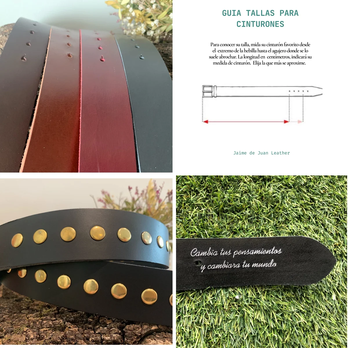 - Hebilla: Hebilla de acabado plata mate, robusta y a juego con las tachuelas, asegurando funcionalidad y estética coherente.
