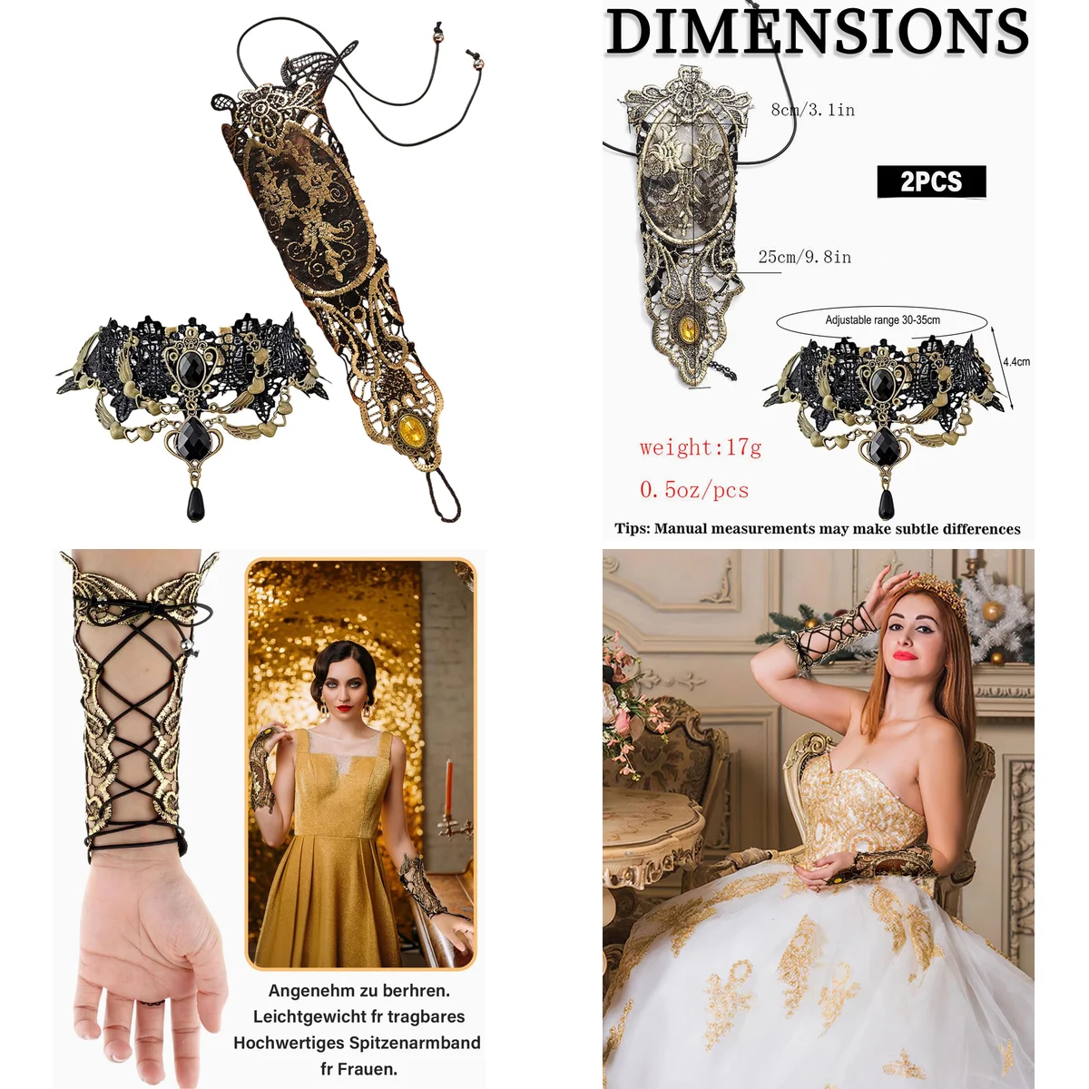 Este conjunto de guantes y collar de encaje, con un marcado estilo victoriano y steampunk, está diseñado para quienes buscan un toque distintivo en eventos especiales, sesiones de fotos o para añadir dramatismo a su atuendo. Ideal para amantes de lo gótico, el rock o para quienes buscan un accesorio de impacto.