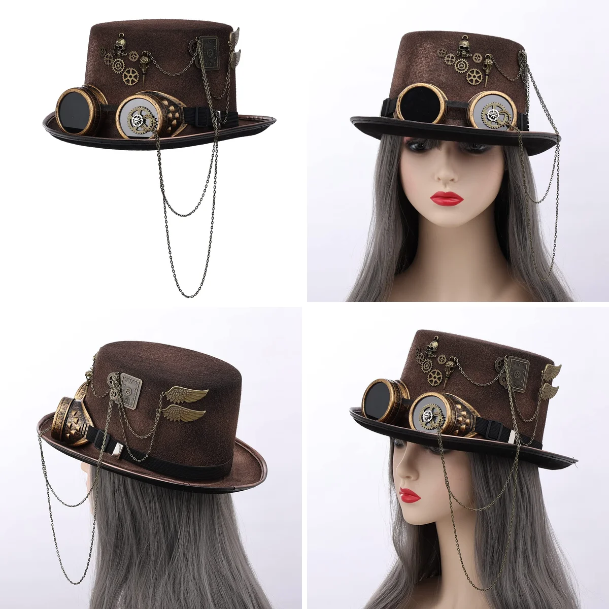 Este sombrero de copa estilo Steampunk, diseñado para hombres y mujeres, es el complemento ideal para eventos de Halloween, fiestas de disfraces o para quienes buscan un toque distintivo en su atuendo gótico, metalero o punk. Su estética de engranajes y gafas integradas evoca la era victoriana con un giro oscuro y mecánico, perfecto para destacar en cualquier reunión alternativa.