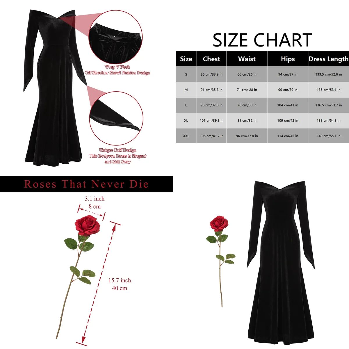 Este vestido de la marca Mrsclaus es una declaración audaz para quienes aprecian la estética gótica, punk, o inspirada en personajes icónicos como Morticia Addams. Diseñado para destacar en eventos temáticos, Halloween, o simplemente para añadir un toque de misterio a tu guardarropa, este diseño de hombros descubiertos y silueta vintage promete capturar miradas.